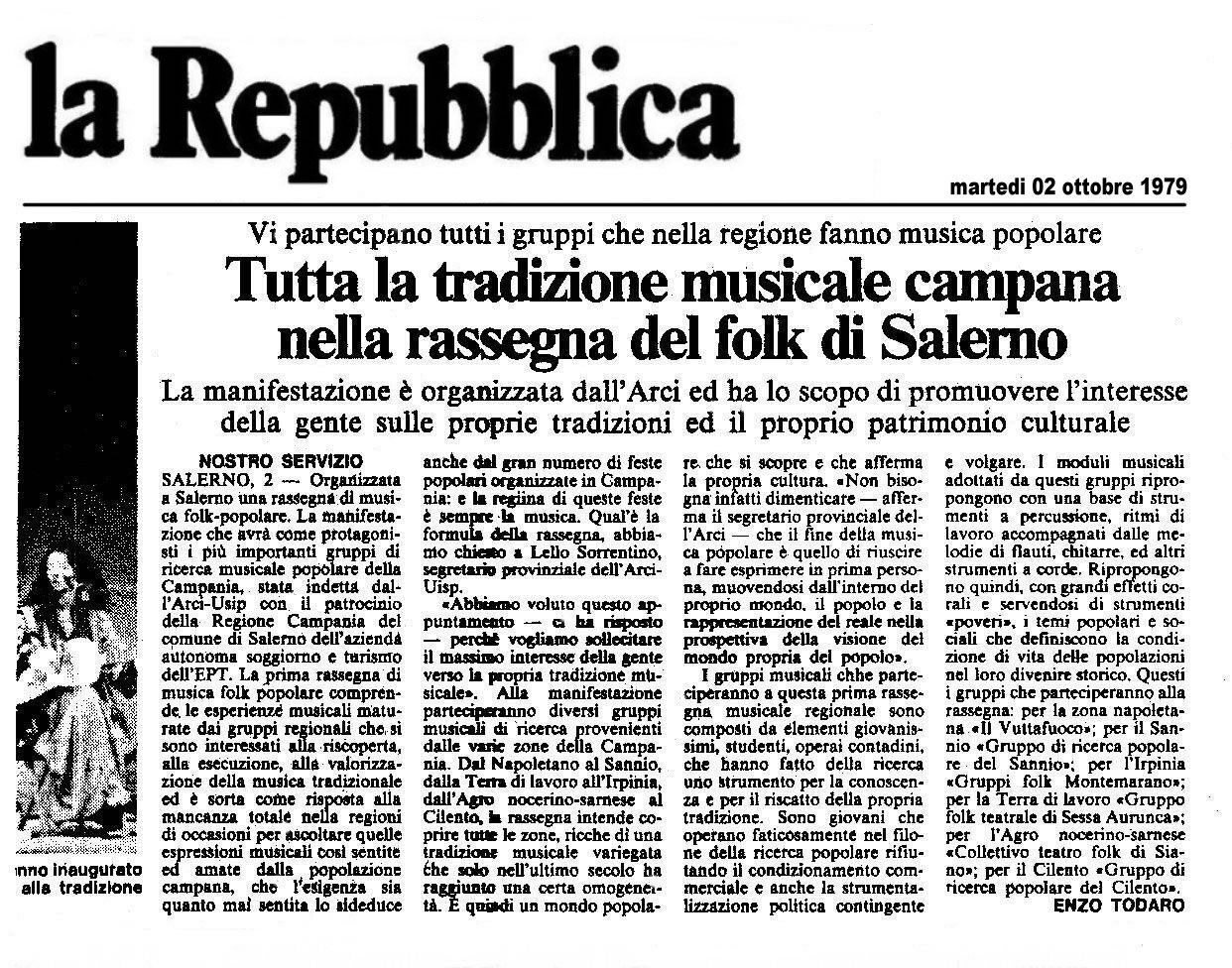 tant’è che è prevalsa sempre la musica. Inizialmente formato da studenti e lavoratori, si avvale in seguito per le sue performance di professionisti di stesura internazionale come il finlandese Jyrki Myllarinen e di tanti altri valenti musicisti come Lorenzo Serra (un’inesauribile vena creativa etnico-jezzistica, ancora oggi nostro stimato collaboratore), Enzo Volpe, Mario Aliberti, Sabatino Leo, Matteo Cirillo (drums e bongas, attualmente docente universitario)ecc. ma anche di studiosi esperti di teatro e letteratura come Girolamo Palomba (‘o milanese), Antonio Di Filippo (Sociologia della letteratura-Un episodio recente della storia della stampa nel Mezzogiorno:la vertenza de “Il Mattino” nelle pagine degli altri giornali; C’erano una volta Ediz.Ripostes; Lo scacco e la ragione Ediz.Milella). Attualmente, in collaborazione con gli ZED (la parte operativa dei “Live Concert”), gruppo di giovani e affermati musicisti, ai primi posti nella classifica nazionale di Radio Rai Uno con“Mercato del lavoro”e “Mandela”, ha realizzato l’Ente socio-culturale COLLETTIVO TEATRO FOLK - ZED “Centro Studi di Ricerca e Diffusione delle Tradizioni Popolari”. L’Ente agisce su tutto il territorio nazionale con autorizzazione del Ministero del turismo e spettacolo. Lo
